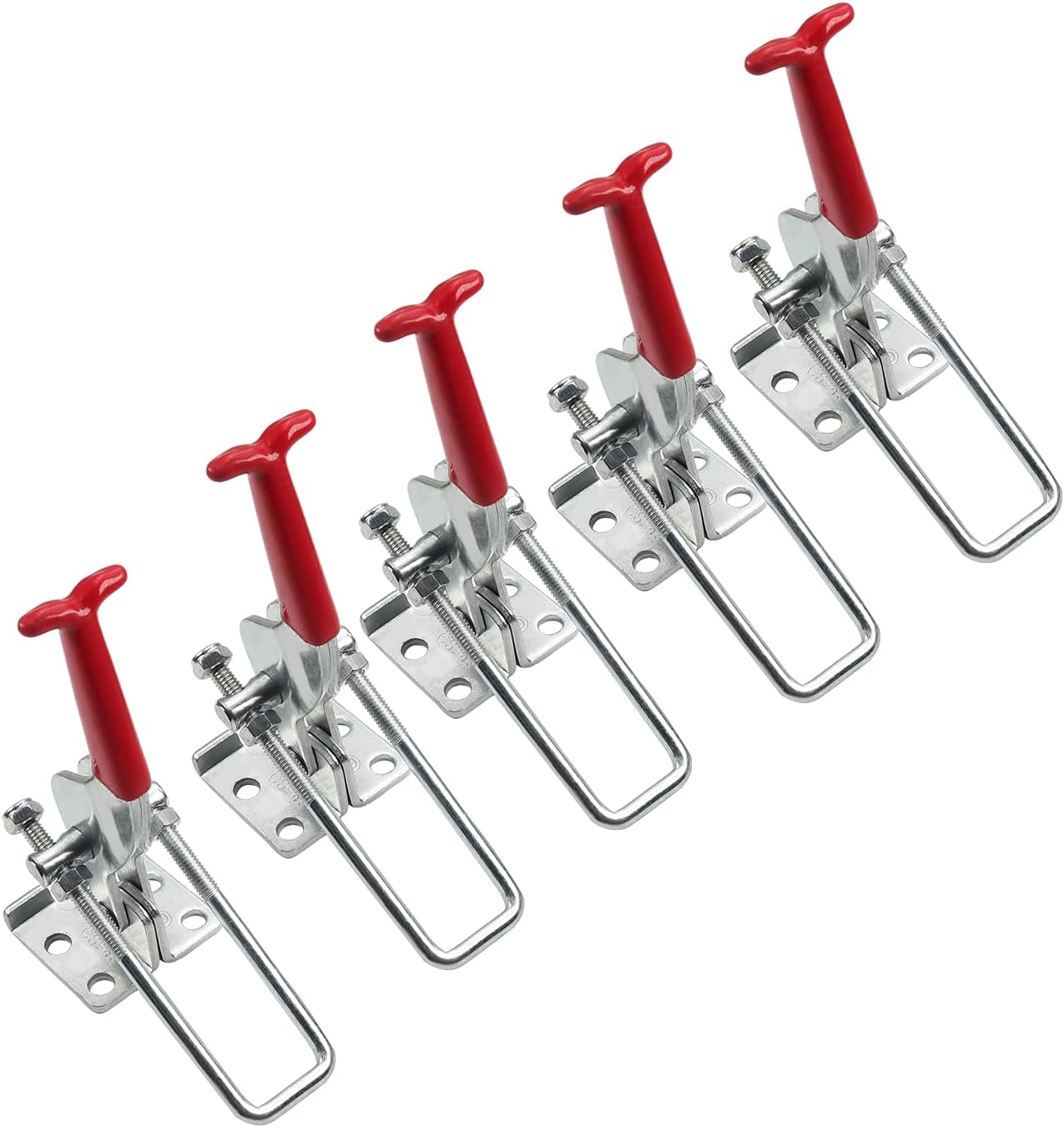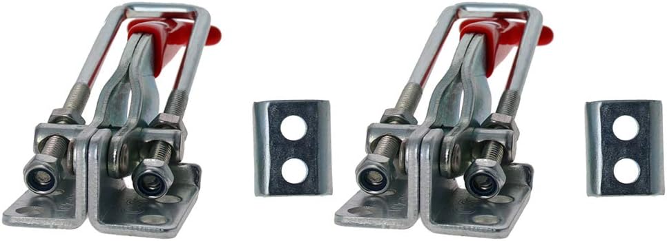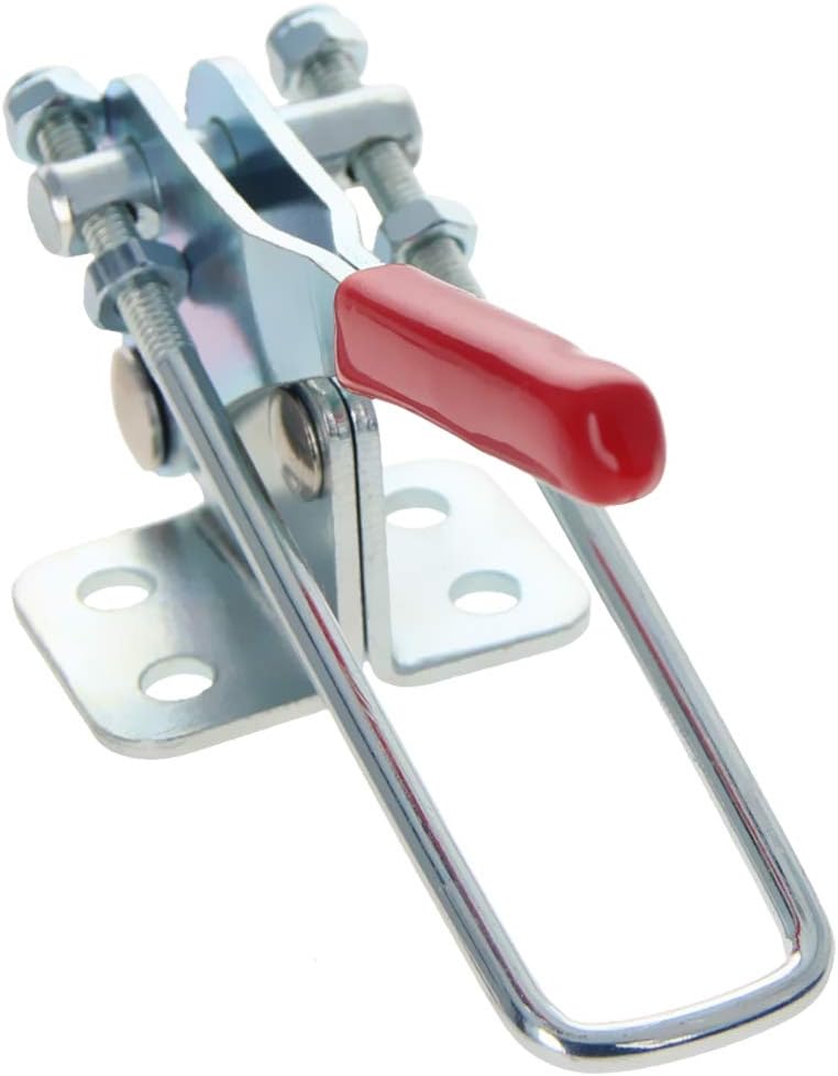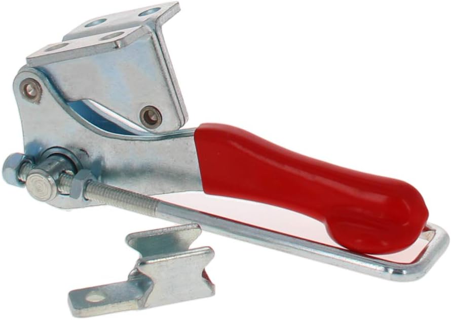 Utoolmart Lever Latch Toggle ClampProduct Features1.The toggle clamp is mainly used to install on jigs, tool fixtures, or movable bases.2.Made of 45# steel, zinc plating for corrosion resistance.3. With adjustable pull bar.4.During clamping, the lever is controlled to prevent impact on functioning due to side thrust.5. Adjustable Plastic cover handle convenient,safe and comfortable operation6. Due to the different monitor and light effect,the actual color of the item might be slightly different from the color shown on the pictures.Technical Parameters* Product Name: Toggle Clamp* Material: 45# Steel* Surface Treatment: Zinc Plated* Color: Red, Silver Tone* Type: Latch Door Button* Model No.: JY-40334* Holding Capacity: 450Kg / 992LbsPackage Content* 2 x Toggle Clamp